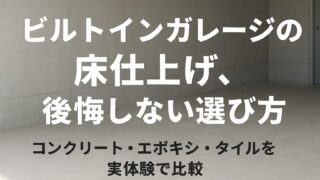 Uncategorized ビルトインガレージの床仕上げをどうする?実体験からわかったおすすめの方法 ビルトインガレージの床仕上げに迷っている方へ。コンクリート・エポキシ塗装・タイルなど4種類を実体験から比較。見た目・耐久性・湿気対策まで解説します。 2025.11.17 Uncategorized